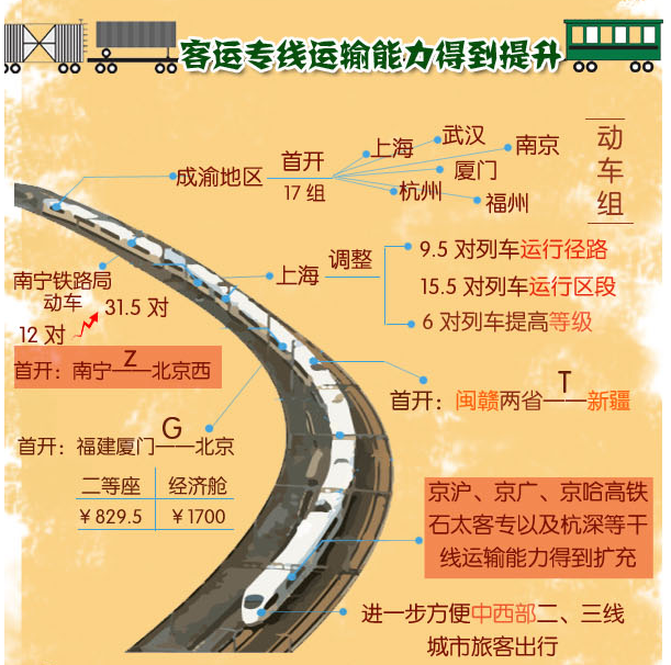 据统计,此次调图共增开旅客列车60.5对。各大铁路局都因地制宜地提出了新的开行方案。成都局西南17对出川动车的开行,将拉近成都、重庆与我国东部、中部发达城市之间的距离。