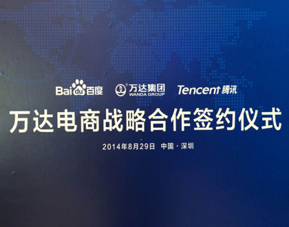 今日上午,万达与百度、腾讯共同召开发布会,就电商层面达成合作。万达、百度、腾讯宣布共同出资在香港注册成立万达电子商务公司,全力发展O2O电商商务模式。三家公司对万达电商的首期投资额高达50亿人民币,其中万达持股70%,腾讯和百度各持股15%。万达集团董事长王健林、百度公司董事长兼首席执行官李彦宏、腾讯公司公司董事会主席兼首席执行官马化腾共同出席签约仪式。