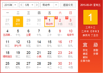 根据国务院办公厅最新的放假通知,2015年劳动节放假安排为:5月1日(星期五)和5月2日(星期六)、3日(星期天)连休。