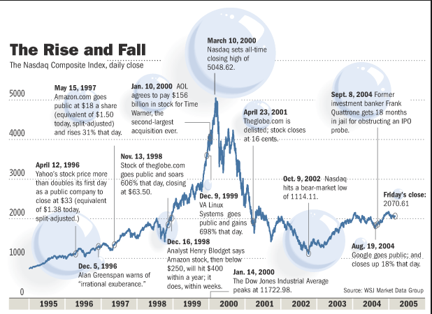 1995年至2001年,在欧美及亚洲多个国家的股票市场中掀起了一轮互联网热潮,与科技及新兴的互联网相关企业的股价高速上升。2000年3月10 日,NASDAQ综合指数到达了5048.62(当天曾达到过5132.52),比一年前翻了一番还多。然而,自这天起,纳斯达克指数开始剧烈下跌。