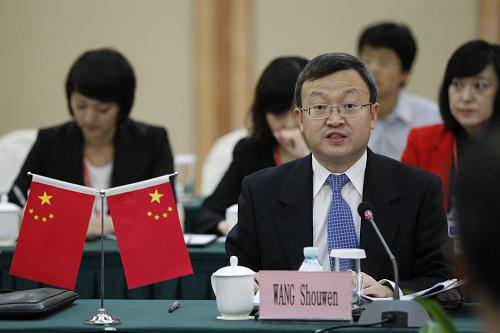 9月22日,中国商务部部长助理王受文(右)和韩国通商产业资源部部长助理禹泰熙在谈判开幕式上握手。