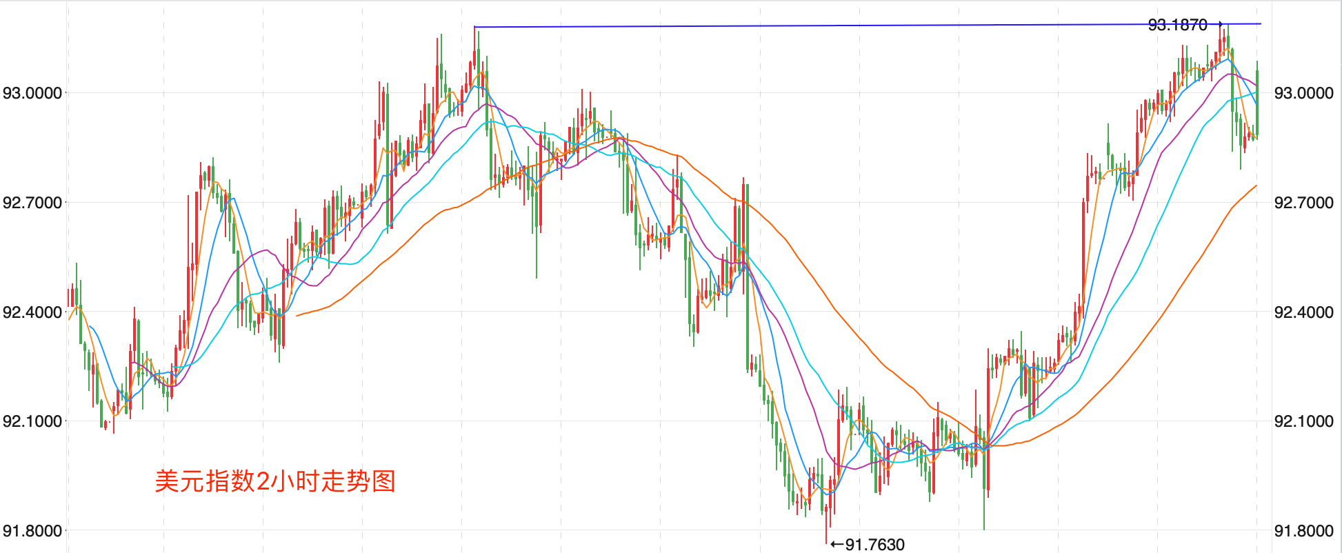 前期持续上涨创出102.99点的高位后一路震荡回落走低,触及89.206点的低位后,开始向上持续震荡走高;整体价格在MA200上方运行。中期走势继续保持震荡向上的走势,价格突破93点的关键阻力后打开上行空间。当前行情日内有回落考验92.7关键支持的趋势。