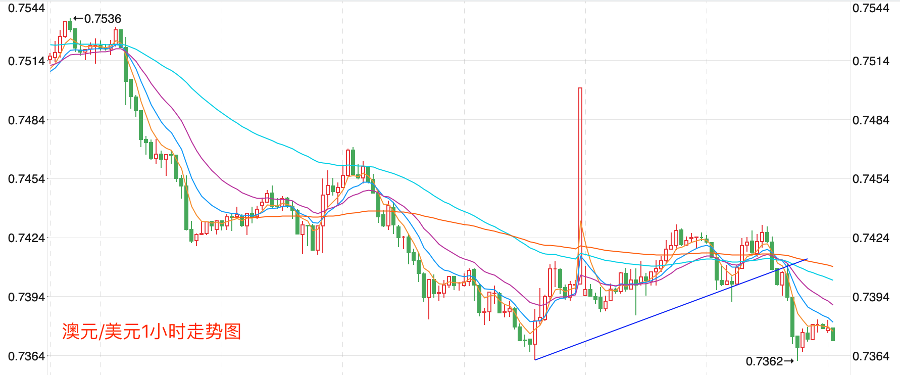 前期自2020年3月底企稳0.56618低点开启上涨走势;盘中突破了MA200均线的关键阻力而上行走高;2021年2月触及0.80072点高位后开始震荡走低,8月底企稳在0.7114点展开反弹调整的走势。当前日内行情有下跌的趋势。