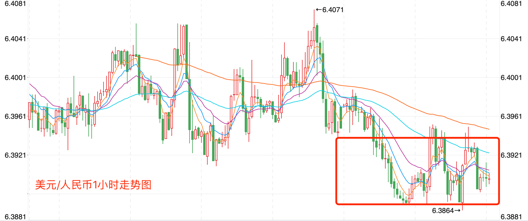 离岸价前期自2020年5月高位7.1964开启下跌走势,盘中跌破MA200均线的关键支持而下行走低;2021年5月触及6.3477点低位后开始震荡走高。当前行情日内有震荡调整的趋势。
