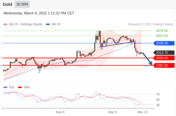 黄金现货 当日内: 短期关键阻力位在2038.00。