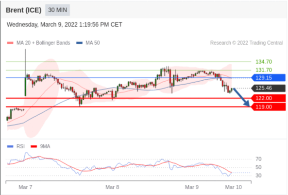 布伦特原油 (ICE) (K2) 当日内: 短期关键阻力位在129.15。