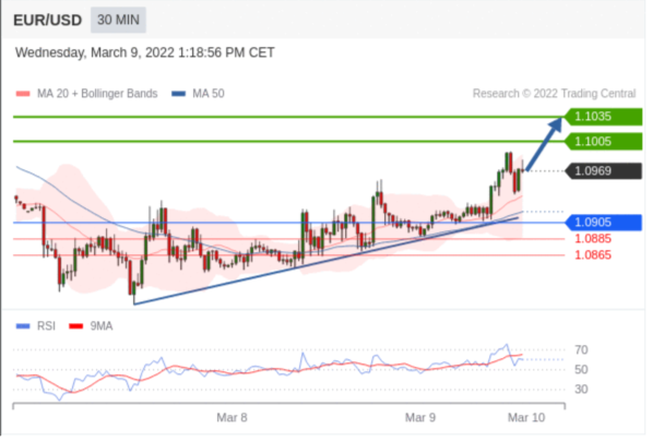 在 1.0905 之上,看涨,目标价位为 1.1005 ,然后为 1.1035 。