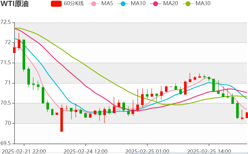 技术面上看,昨日国际油价亚欧盘持续下行回落走低,走势接连跌破72美元、71美元整数支撑位,晚间美盘油价加速下行到达70.2附近后低位震荡收盘,日K线报收阴线实体。均线系统出现拐头下行迹象,空头动能表现占优势,中期走势重新回到区间内,整体走势处于区间内下行为主。今日油价短线关注下方69.3-69.0附近支撑,日内保持顺势参与为主。