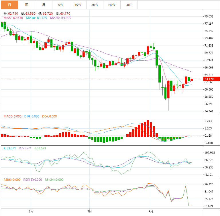 周二4 月 22 日,美原油价格交投于 63.2 美元 / 桶附近。从日内走势来看,亚欧盘时段原油价格小幅回落下探,在企稳 61.8 关口后迎来震荡回升,晚间美盘以及凌晨油价强势企稳回升,突破并站上 62.5 关口后延续反弹上行至 63 上方强势收盘,日 K 线报收震荡回升中阴。